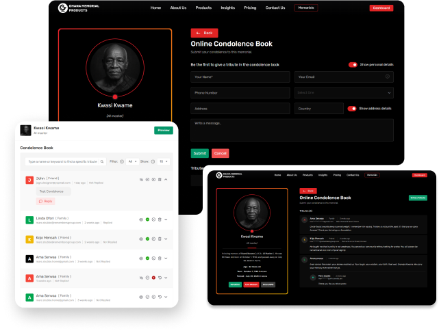 The online condolence book comes with the Ghana Memorial, free or paid. Do you want to start an online condolence book, start the Ghana Memorial and you will have an operational online condolence book right away.