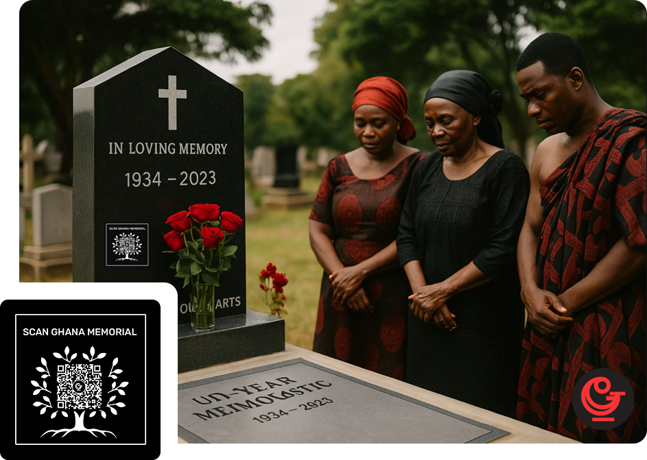 Connect memories to the very place they rest. With a weatherproof QR sticker on the tombstone, every graveside visit opens the Ghana Memorial—photos, tributes, and life stories instantly accessible. A simple scan turns stone into story, making your loved one's legacy forever present.